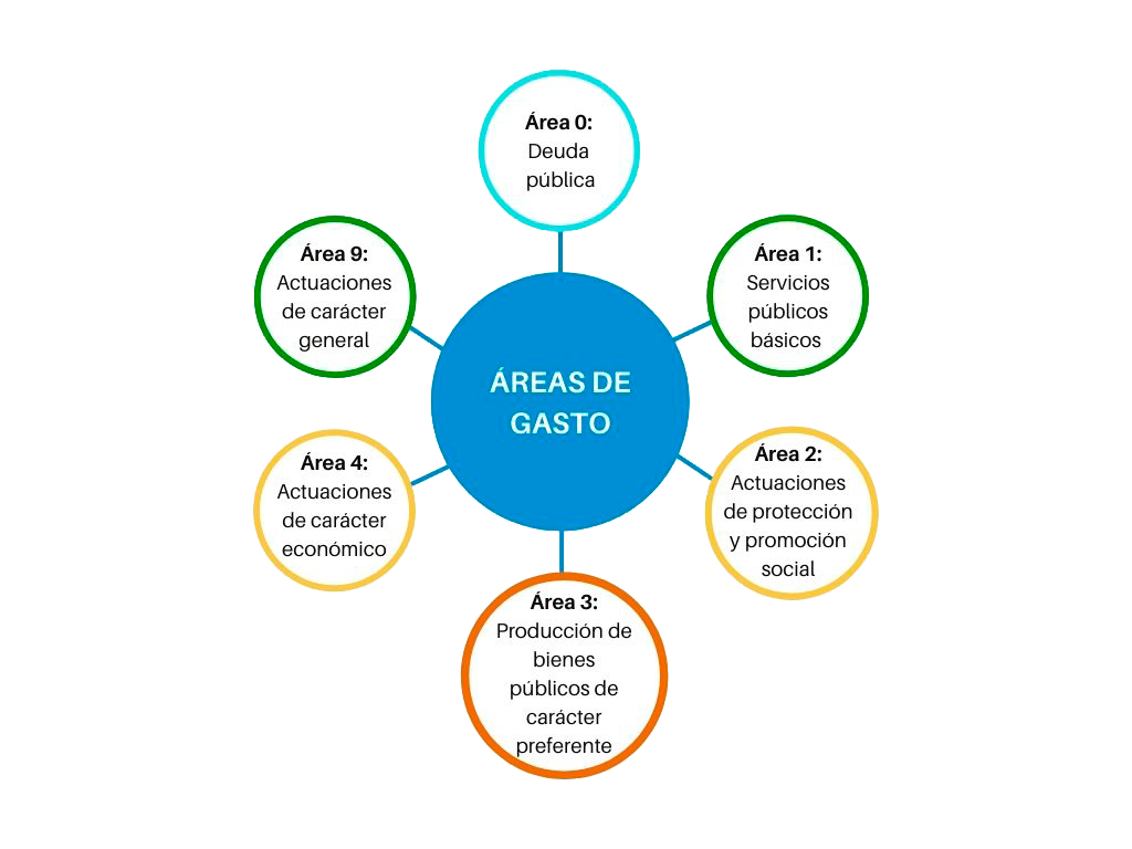 Les àrees de despesa integren polítiques de despesa, que al seu torn són grups de programes i finalment programes. Els programes pressupostaris integren conjunts de crèdits destinats a la mateixa finalitat. Les àrees de despesa són les següents.